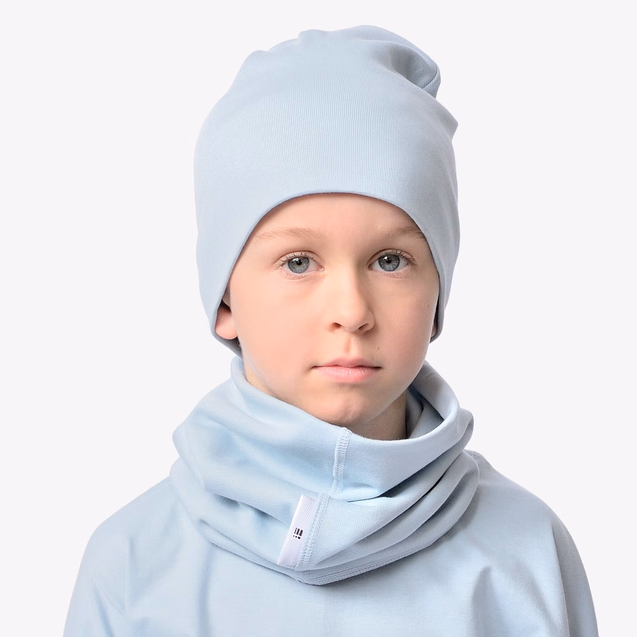 Köp mössa och halsduk till paketpris! Ljusblå mössa med tillhörande tubhalsduk i ljusblå. Mössan är prydd etikett med vår logga i sömmen. Tubhalsduken har våran etikett i sömmen.
