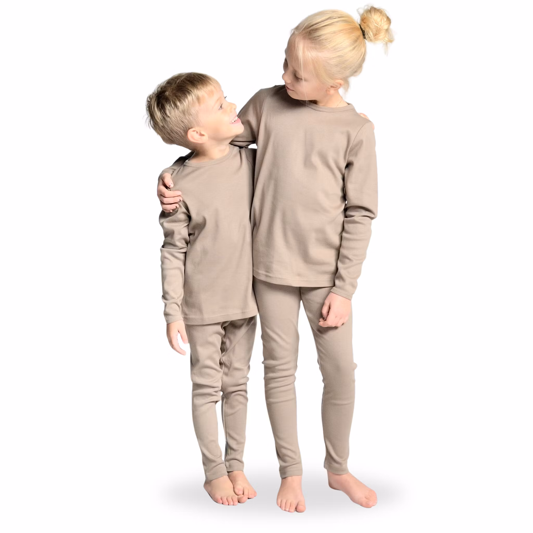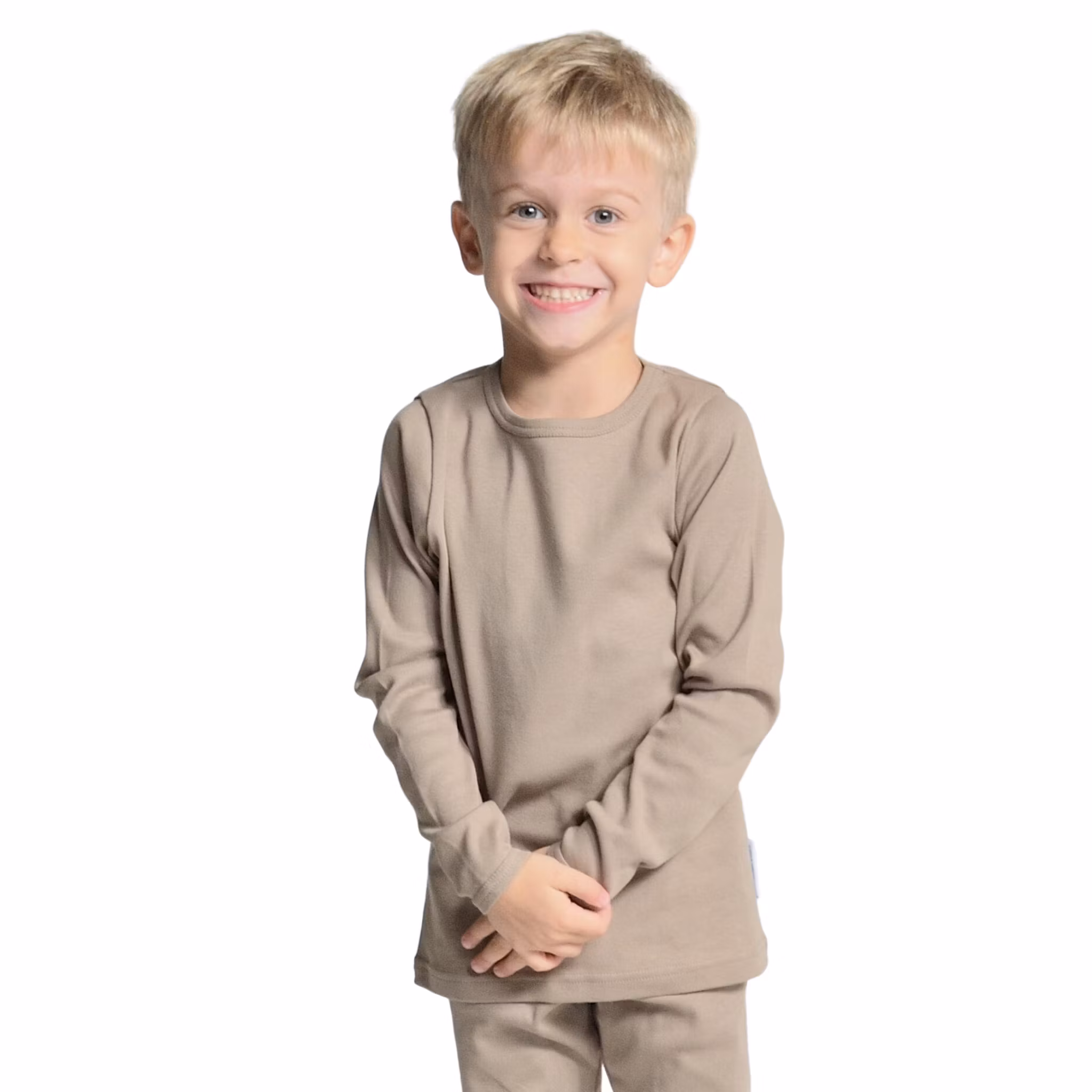 Nilo pyjamas i creamy brown är en pyjamas till barn i mjuk ekologisk bomull. Pyjamaströjan är sydd med ett fint kantband vid ärmslut. Den lite lösare passformen gör pyjamasen bekvämare för ditt barn att sova i.